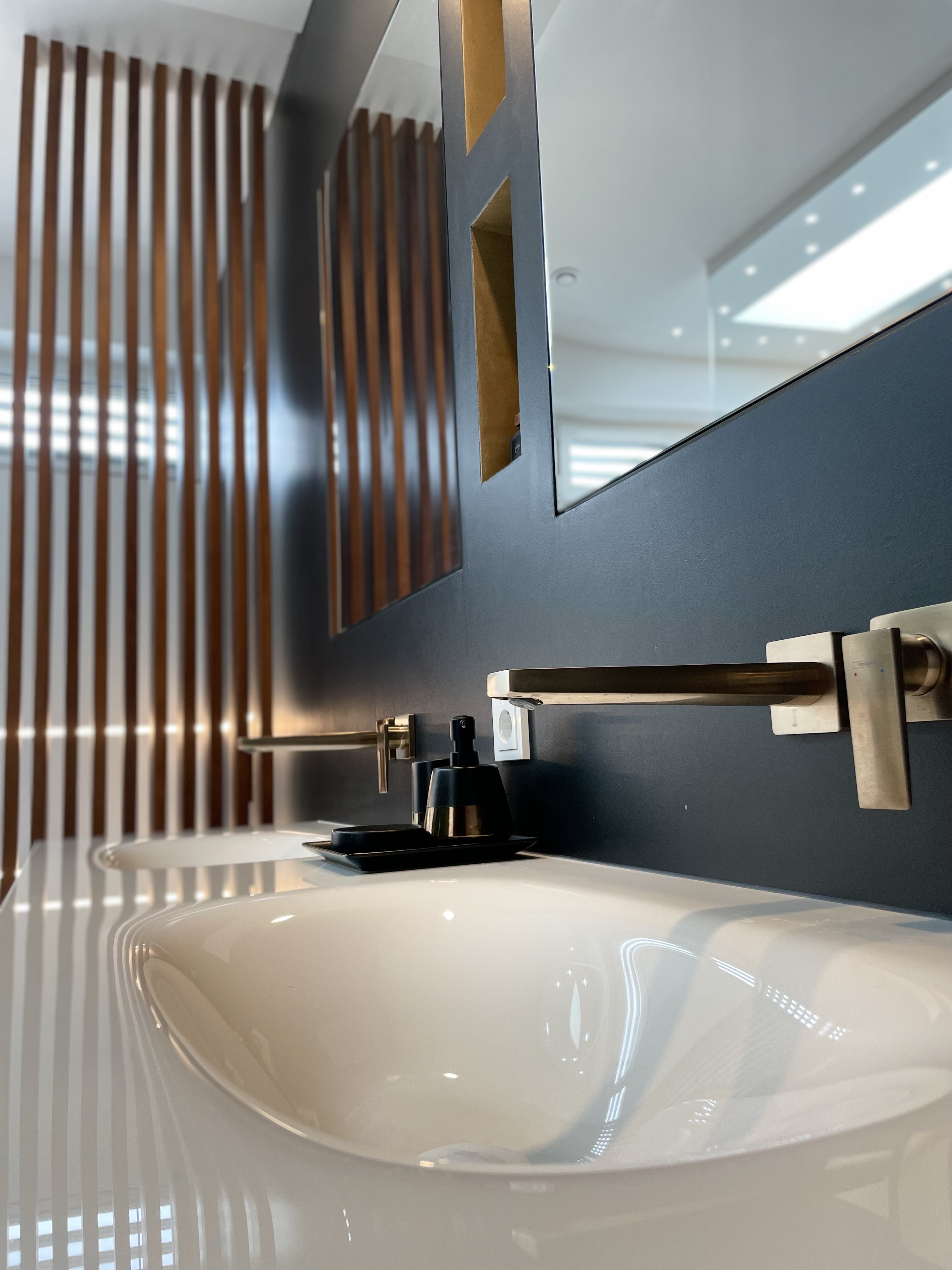 Das Badkonzept folgt einer klaren gestalterischen Linie: dunkle, ruhige Flächen, gezielte Lichtführung und natürliche Akzente. Besonderes Augenmerk lag auf dem Raumgefühl – Offenheit, Großzügigkeit und Ruhe standen im Mittelpunkt.