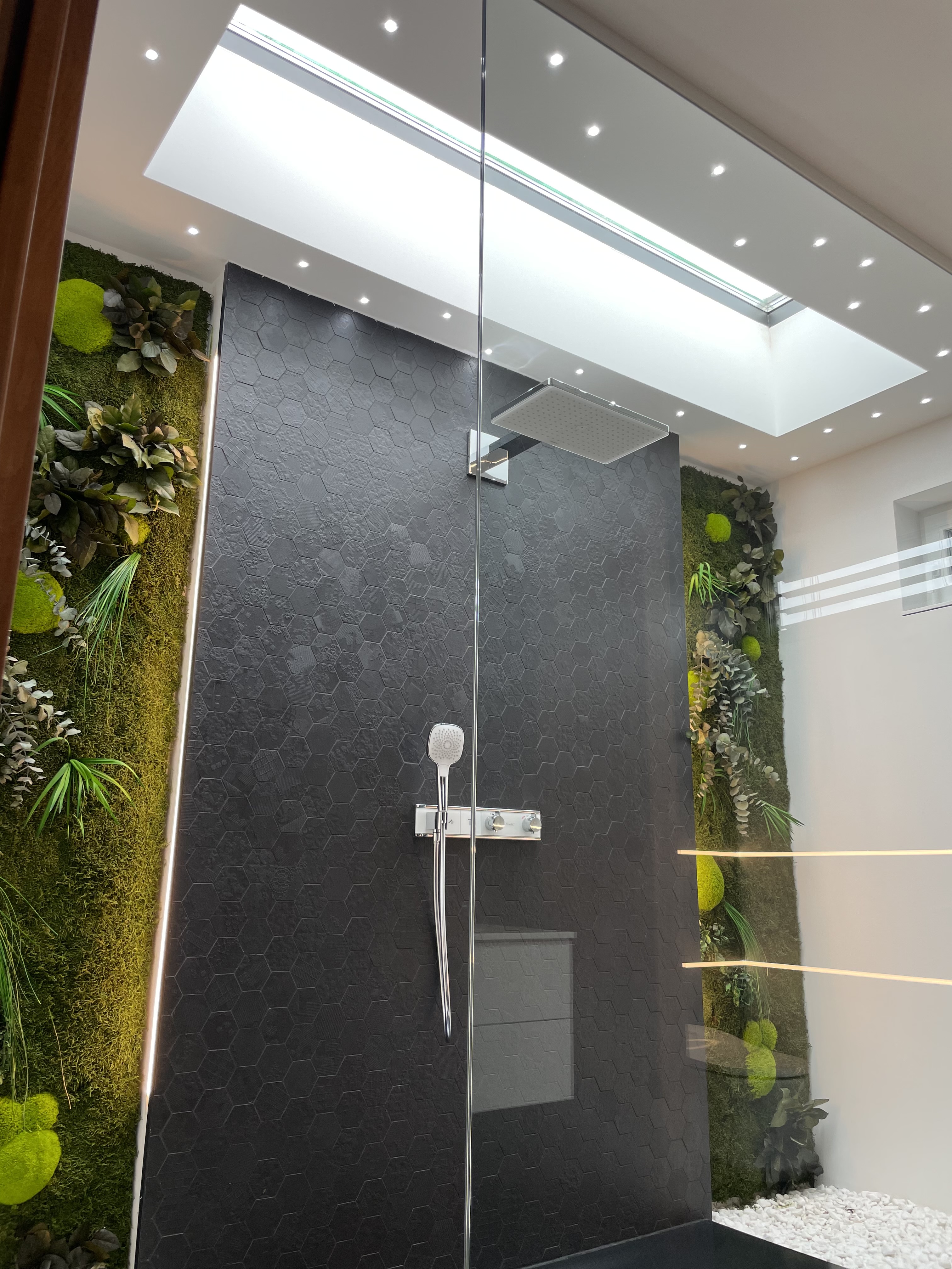 Dieses Projekt steht für kompromissloses Design, moderne Technik und ein außergewöhnliches Raumgefühl. Ziel dieses Projekts war es, ein Badezimmer zu schaffen, das Architektur, Natur und High-End-Badgestaltung nahtlos miteinander verbindet.
