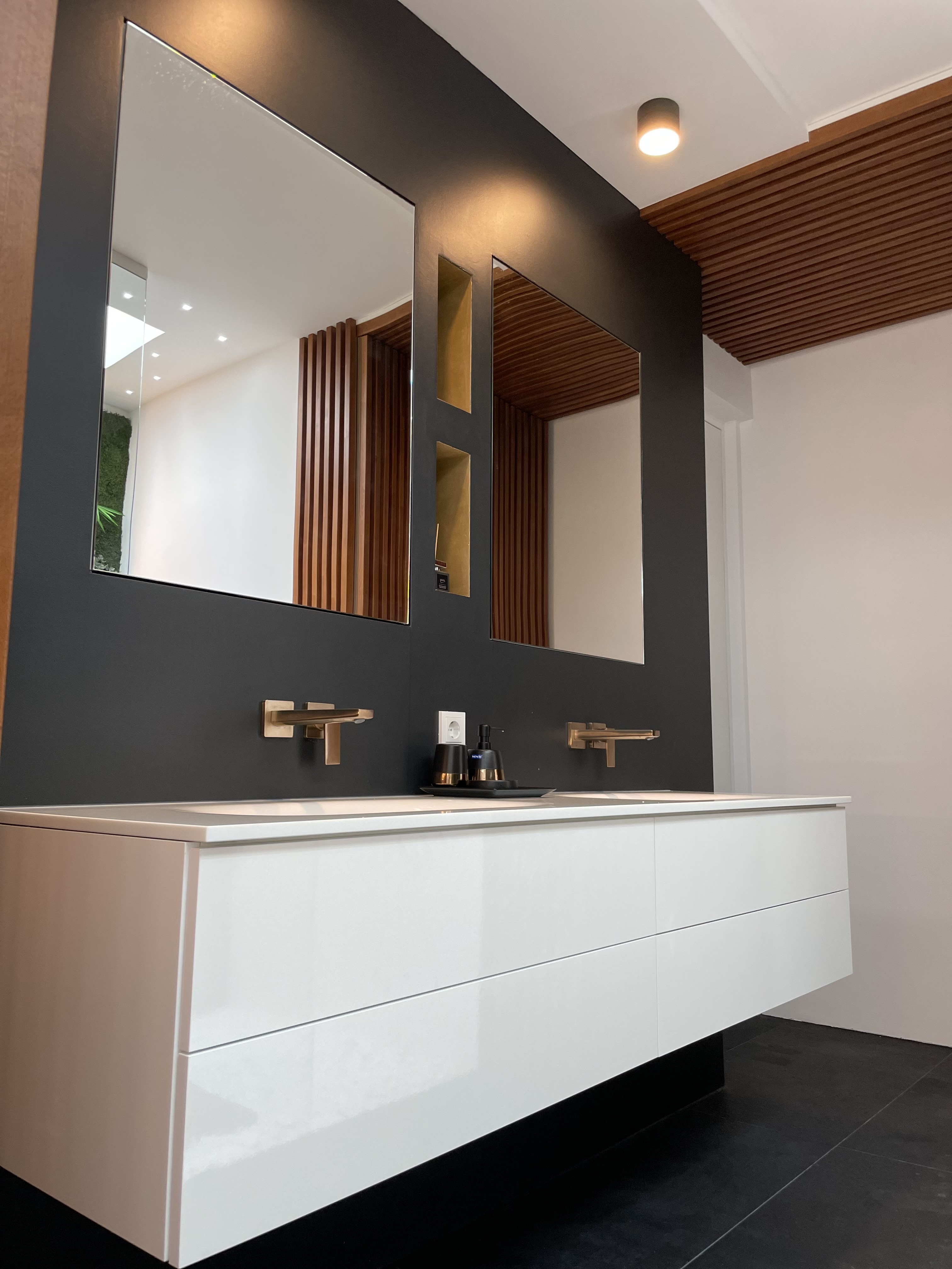 Das fertige Badezimmer vermittelt Ruhe, Wertigkeit und architektonische Klarheit. Die Kombination aus dunklen Oberflächen, warmen Holzelementen und gezielt eingesetztem Licht erzeugt ein einzigartiges Spa-Gefühl – privat, hochwertig und zeitlos.