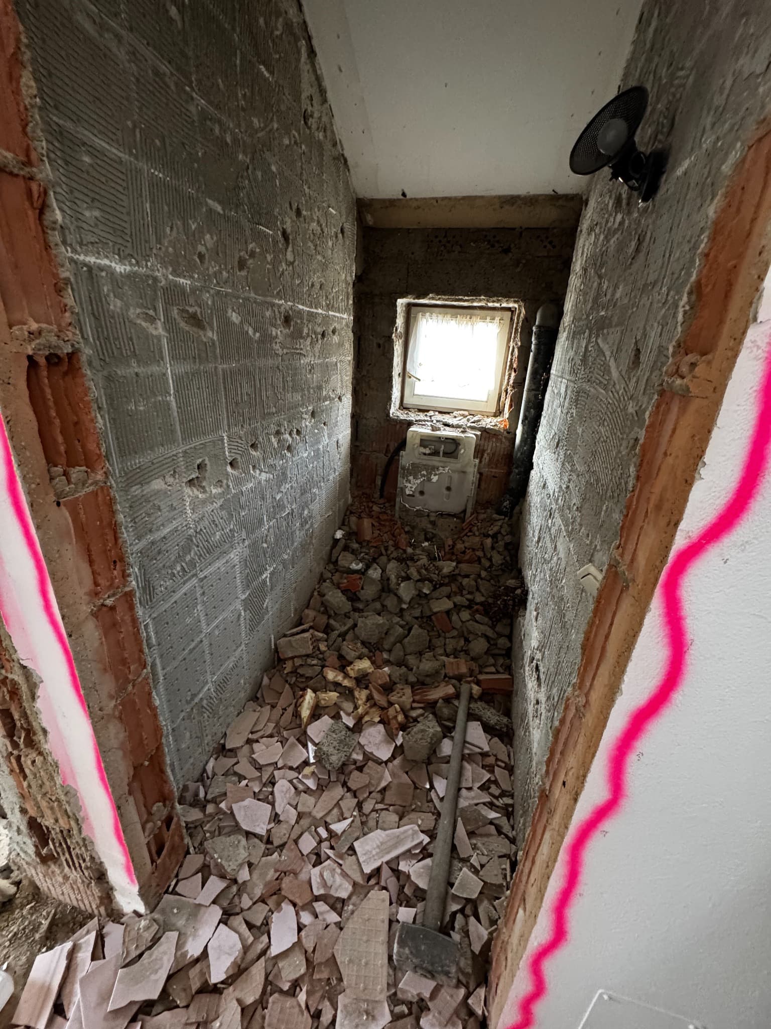 Das ursprüngliche Badezimmer war geprägt von rosafarbenen Wandfliesen, dunklen Bodenbelägen und einer stark fragmentierten Raumaufteilung. Sowohl das Hauptbad als auch das separate WC entsprachen nicht mehr heutigen Ansprüchen an Komfort, Licht und Ästhetik.