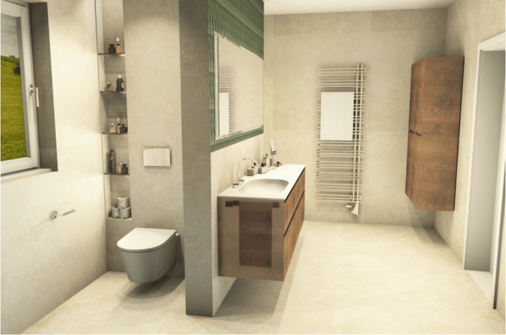 Das neue Konzept basiert auf den AMIA Kernprinzipien: Klarheit, Harmonie, ruhiges Raumgefühl, natürliche Materialien und funktionale Modernität. Großformatige Steinfliesen, ein warmer Holzwaschtisch und eine verdeckte Walk-In-Dusche prägen das neue Design