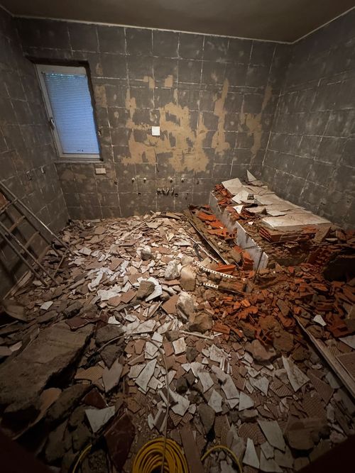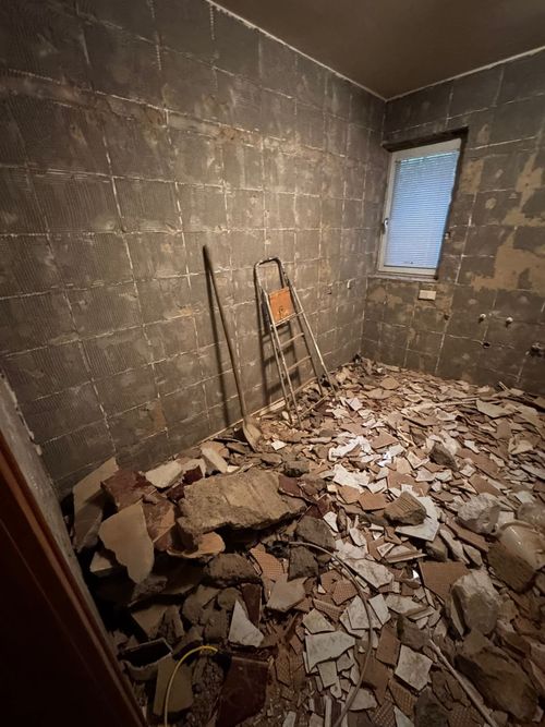 In der Entkern-Phase wurde das gesamte Badezimmer entkernt: Entfernung aller Fliesen, Ausbau der alten Dusche/Badewanne, Freilegung der Installationen sowie Vorbereitung für die neue Fußbodenheizung und das wandhängende WC.